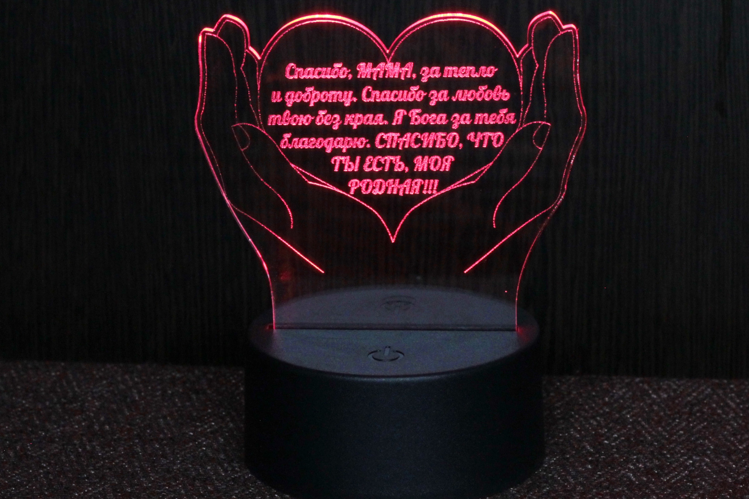 Надпись сделаю любую по Вашим пожеланиям. Пластины сменные (то есть потом можно будет докупить другую пластину и ночник станет совсем другим ? ). 7 режимов подсветки. Питание от microUSB (в комплекте идёт шнур для питания от компьютера/ноутбука, или можно включить в сеть зарядкой почти от любого современного мобильника) или от 3-х батареек AA (в комплекте нет).