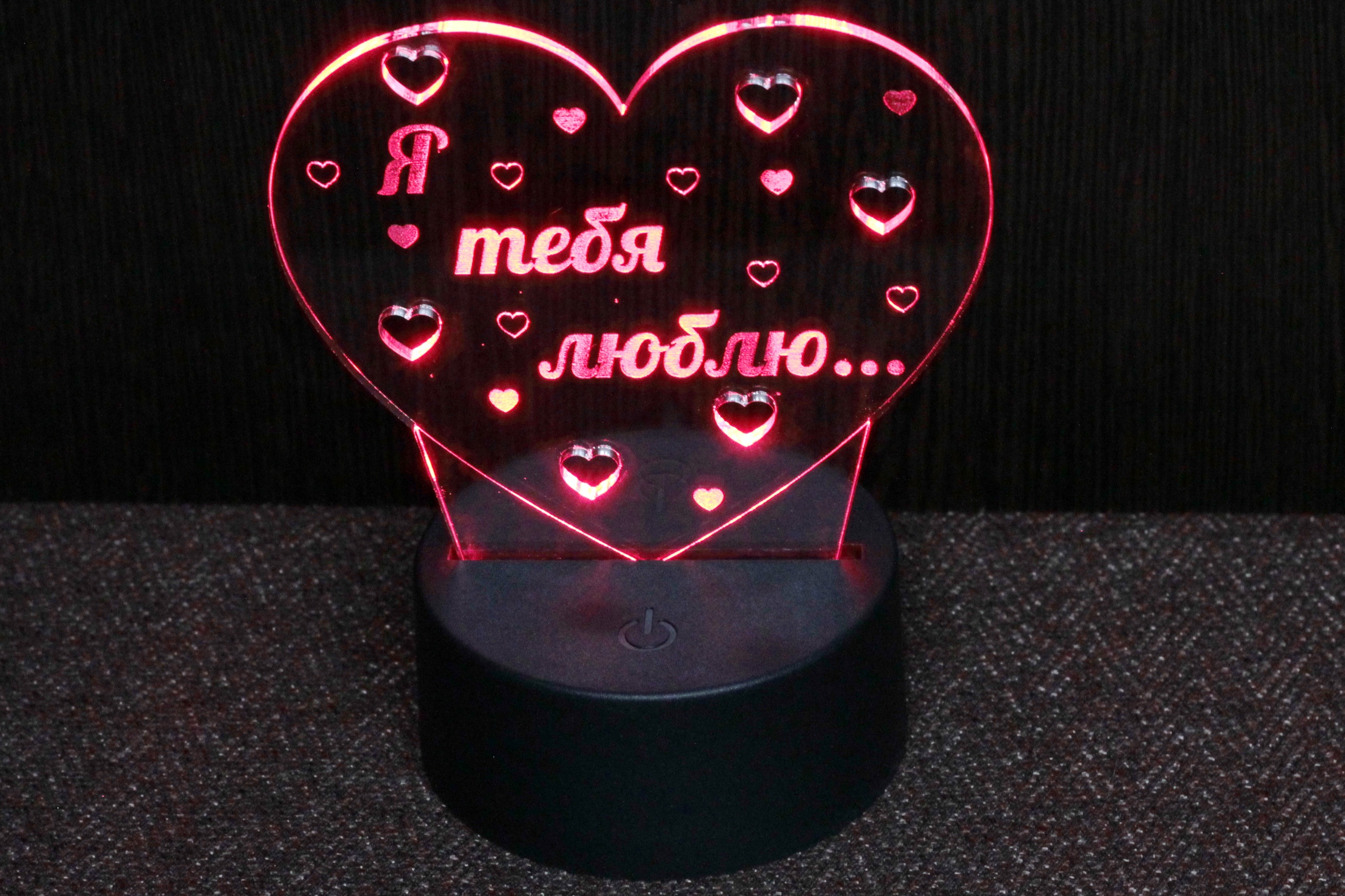 Надпись сделаю любую по Вашим пожеланиям. Пластины сменные (то есть потом можно будет докупить другую пластину и ночник станет совсем другим ? ). 7 режимов подсветки. Питание от microUSB (в комплекте идёт шнур для питания от компьютера/ноутбука, или можно включить в сеть зарядкой почти от любого современного мобильника) или от 3-х батареек AA (в комплекте нет).
